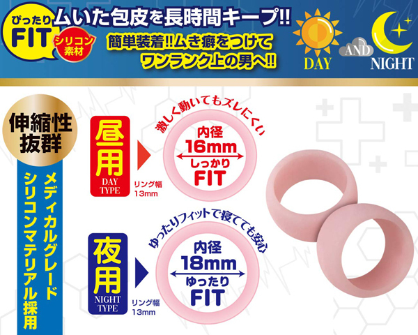 商品番号 :p12367 色 : 種類: 仕様:パッケージ:13.0×8.1×2.2cm 本体:昼用(内径1.6cm、リング幅1.3cm)・夜用(内径1.8cm、リング幅1.3cm)ムいて、付けて、包皮を長時間キープ!使い心地なめらかで伸縮性抜群な包茎矯正リングが2本セットで登場。