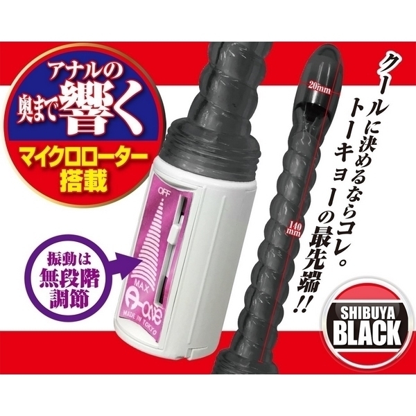 ¥1490(定価¥3355)  商品番号 :p14361  色 :ブラック  種類:渋谷  仕様:パッケージ:21.0×5.0×3.5cm 本体:20.5×2.0cm 日本製 電池:単四電池×3本使用 アナルトーキョーからシリアナ快感を世界へ!奥まで響くマイクロローターを搭載したスティック型アナルバイブ。 ●渋谷ブラックカラータイプ●フレキシブルな柔軟ボディ●ポコポコ刺激のスクリュー型●挿入部約14cm、最大径約2cm●先端にマイクロローター搭載●奥まで届くパワフルな振動●振動調整は無段階スライド式●安心安全な日本製グッズ。 ぷっくりヘッドにパワフルモーターを搭載した、スリムなスティックフォルムの電動アナルグッズです。      |
