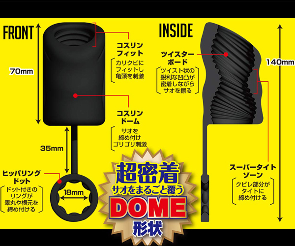 ¥730(定価¥1650)  商品番号 :p14364  色 :  種類:  仕様:パッケージ:19.5×9.5×5.0cm 本体:全長14.0cm・リング内径1.8cm・連結部3.5cm・先端部7.0cm あのコスリングがパワーアップして帰ってきた!手コキ以上の快感×オナホ以上の衝撃が押し寄せる…ッ!新感覚オ〇ニーグッズ第2弾!!睾丸や根元を締め付けるリングはドット付きに進化し早漏防止&勃起力UP!!竿をまるごと覆う超密着なDOME形状が全体を包み込みハードに締め付ける!ツイスト状の凹凸がゴリゴリと責め、内部のクビレ部分が単調ではない刺激を生み出します。 自由に擦るだけで最高の射精感、まさにストライクな一撃!普通の手コキでは得られない圧迫感、オナホの煩わしい後処理にサヨナラ!      |