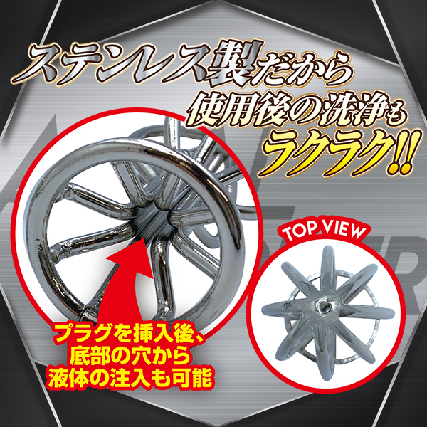 ハードな刺激が次第に快感へ変わり痛気持ち良さの深みにハマる!プラグを挿入後、底部の穴から液体の注入も可能!ステンレス製なので温熱・冷却しての使用、煮沸消毒もOK♪使用後の洗浄もラクチン。