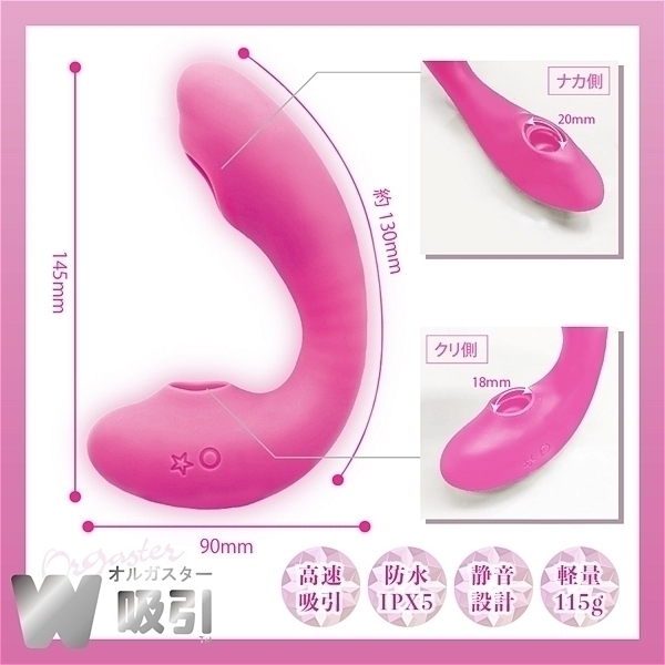 Wで吸う。 新構造吸引システム−エアバルブ方式−でク●イキ・ナカイキ連続ゼッチョウの嵐を巻き起こす。 USB充電式。 軽量・静音設計、シリコン製の柔軟に曲がるフレキシブルネック。 防水(IPX5)仕様でお手入れ簡単。 ●カラー:ピンク