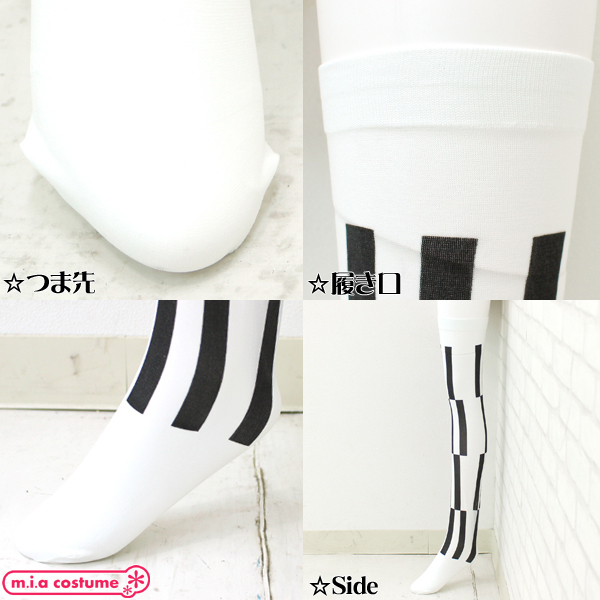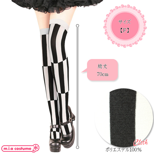 ゴシック&ロリータファッションと相性抜群!ブロック模様の白黒ストライプ柄ニーハイストッキング70cm。 個性的でお洒落なデザインで足元を可愛くコーディネートしよう♪コスプレやハロウィン仮装と合わせても◎ ※色落ちの可能性があるため、塩素系漂白剤での漂白&水洗い不可。