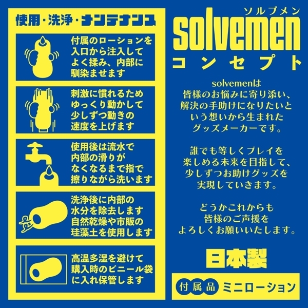 商品番号 :v04006 色 : 種類: 仕様:パッケージ:18.0×8.0×8.0cm 本体:15.0×6.5×6.5cm 重量:400g ミニローション付き やわらかな素材で包み込む非貫通オナホです♪刺激に敏感な方でも使いやすいよう、内部には低刺激のイボが優しく配置されています!ソフトな感触が奥までしっかり届き、安心して楽しめる設計です♪ヒダとイボの組み合わせが絶妙で、自然な快感バランスを実現しました!無理なく使い続けられるので、毎日のリラックスタイムにもぴったりです♪長時間でも疲れにくい構造で、使うたびに自分のペースを整えることができます!軽量で扱いやすく、初心者にもおすすめのアイテムです♪ミニローション付きですぐに使用可能!繰り返し使える日本製の高品質な非貫通オナホとして、多くの方に好評です♪